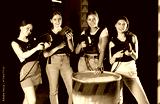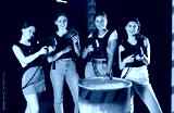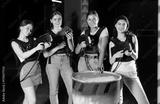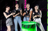 Four cheerful and happy girls pose in locker room before laser tag match. Modern entertainment, hobby, tactical outdoor game.