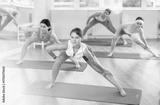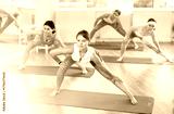 Young woman standing performs exercises during Pilates workout. Girl squats, bends down, does stretching