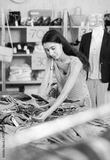 While shopping, girl scans barcode on label of denim trousers or shorts, verifies authenticity of eco-friendliness of clothing production, quality certificate. Responsible consumption...