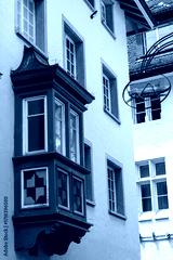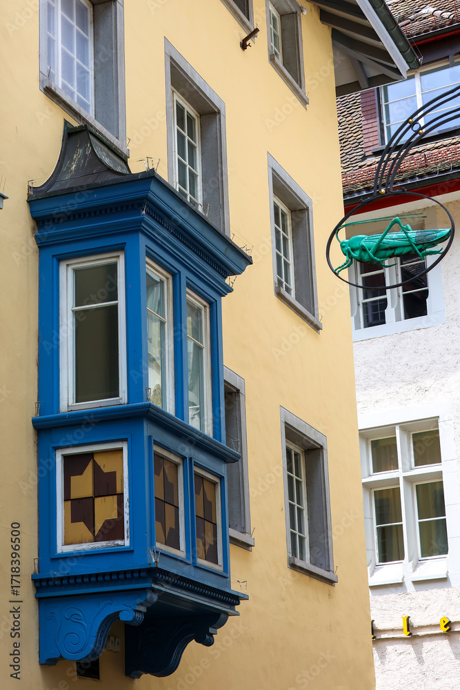 Facade of a historic building with a decorative blue balcony. Zurich, Switzerland