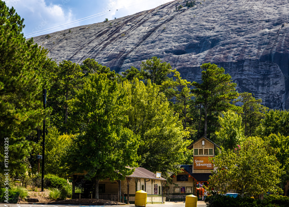 Entrance area at Stone Mountain Park with trees and granite mountain backdrop
