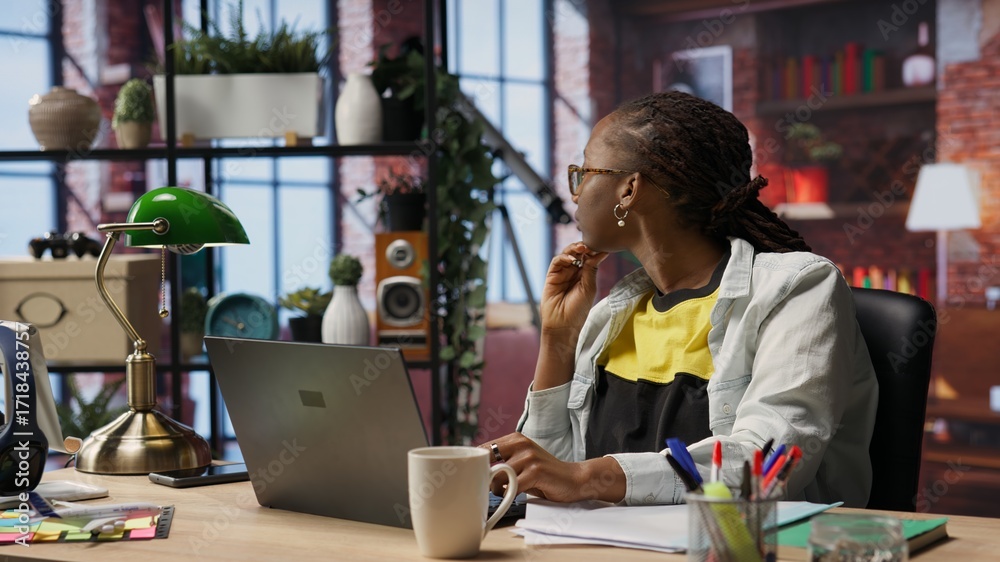 Remote employee pausing work done on laptop at home to pensive thinking. Teleworker in apartment feeling bored by repetitive tasks, stopping work on notebook to daydream, camera B