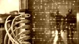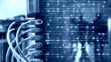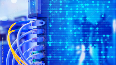 Network equipment. Internet switch. Fiber optic cables of industrial router. Modern network equipment. Internet switch with neon lights. Telecommunications technologies. Internet switch for enterprise