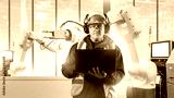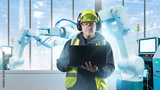 Engineer in helmet and safety vest controlling robotic arms with laptop in modern factory, automation and industrial robotics. Engineering, Industry, Automation.