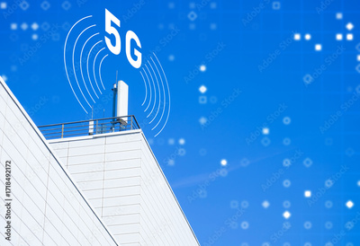 5G antenna on rooftop with digital network overlay, symbolizing modern communication, high-speed internet, and wireless technology infrastructure. Technology, Communication, Infrastructure.