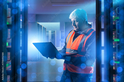 Technician with laptop in data center, managing servers and IT infrastructure, concept of cloud computing, cybersecurity, and digital technology. Technology, IT, Data.