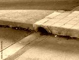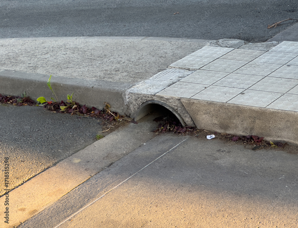 A concrete storm drain opening at the street curb, part of a city's urban infrastructure for managing rainwater