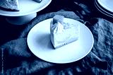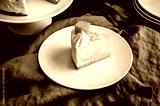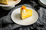 Slice of Mango Mousse Cake on a Plate Angled View: Piece of swirled mousse cake with with a stack of plates, forks, and cake stand in the background