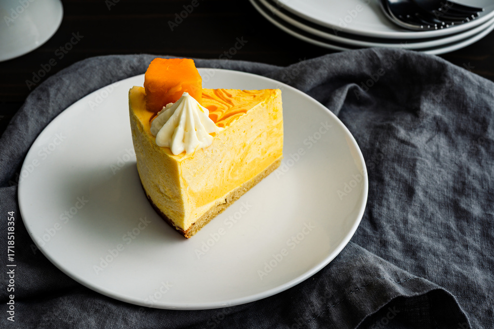 Slice of Mango Mousse Cake on a Plate Close-up: Angled view of a piece of swirled mousse cake with cream cheese frosting on a dessert plate