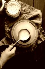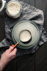 Hand Holding a Measuring Cup of Soaking Sticky Rice: Scoop of glutinous rice held over a glass bowl full of cloudy water and soaked sweet rice