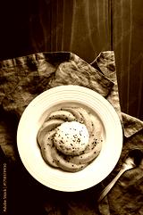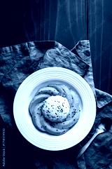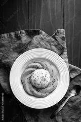 Mango Sticky Rice Drizzled with Coconut Sauce in a Shallow Bowl Overhead: Thai dessert made with glutinous rice, fresh fruit, and toasted sesame seeds