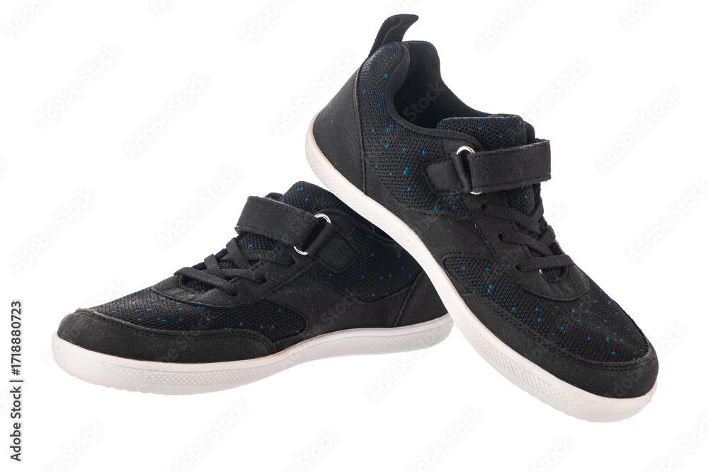 Pair of Black barefoot Athletic Sneakers with Blue Accents on a White Background