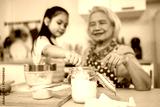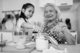 Asian granddaughter baking bakery with grandmother in kitchen at home.