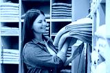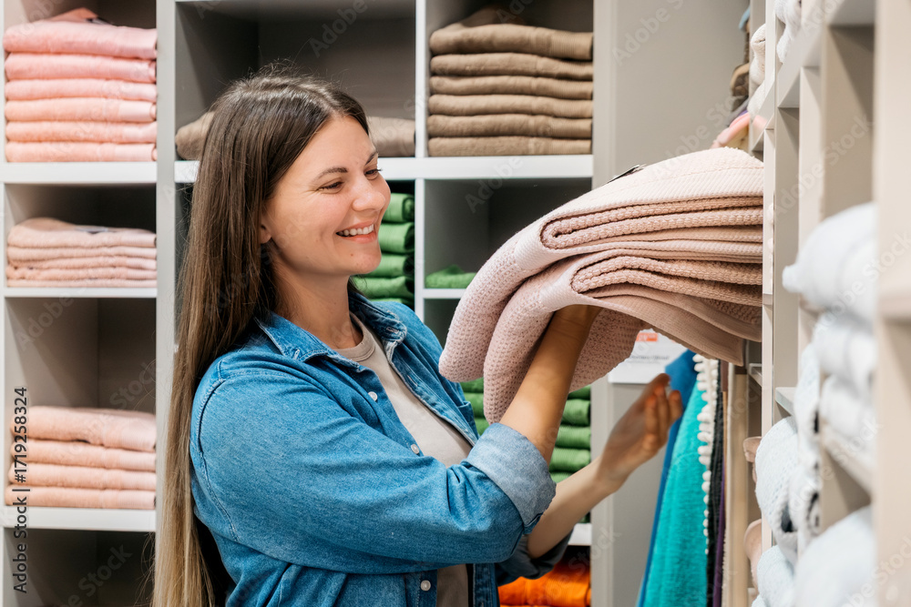 Smiling woman with long hair wearing denim shirt is organizing soft towels on shelves in a retail store, showcasing vibrant colors and textures in a cozy shopping environment