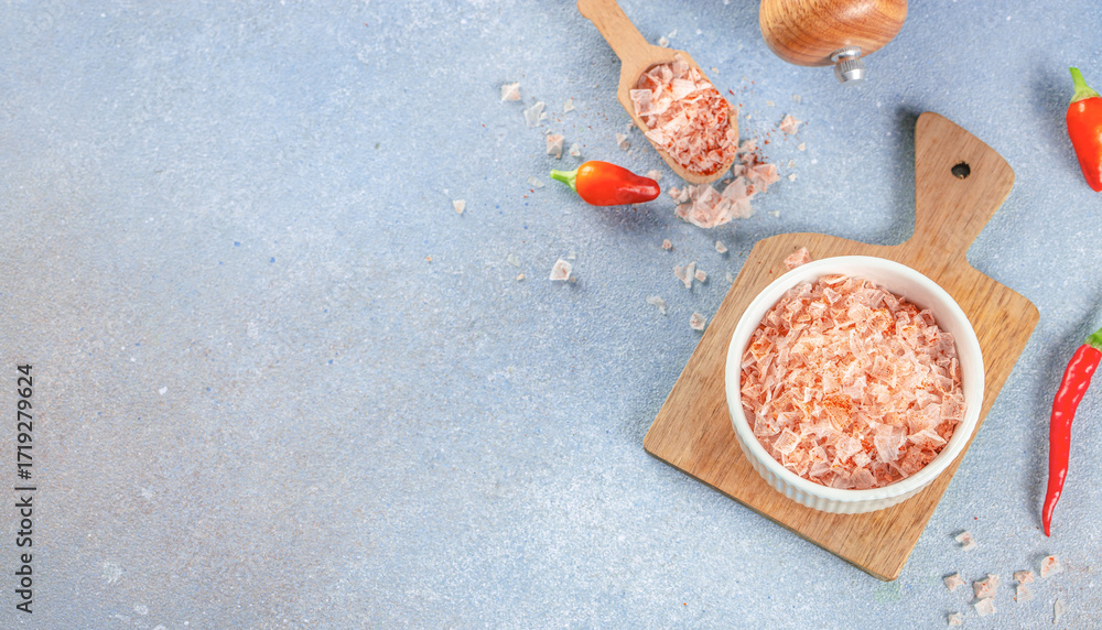Spicy chili flavored salt in bowl with red peppers on blue background, top view, copy space