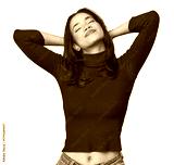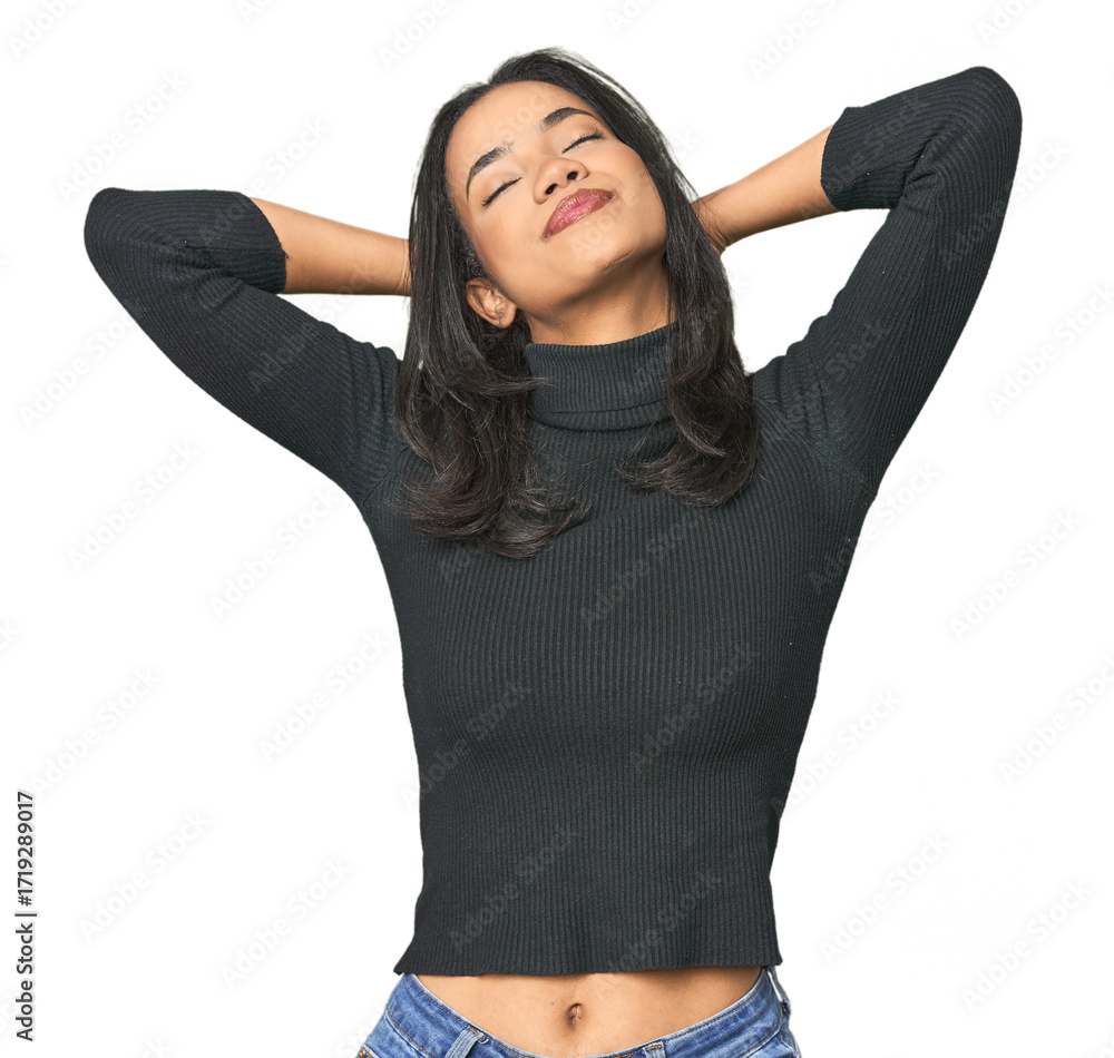 Simple portrait of a young Latina feeling confident, with hands behind the head.
