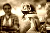 Close up of a man holding a glass of red wine during a toast at a party. Concept of winetasting, celebration and Italian lifestyle with people laughing in the background.