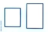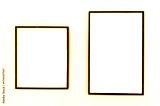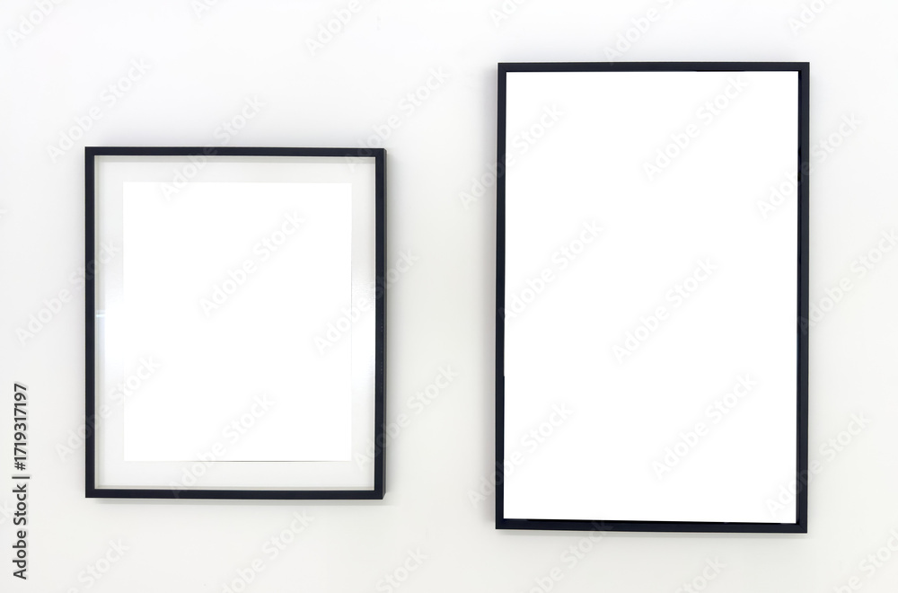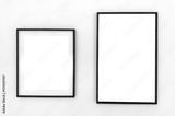 Two empty black photo frames of different sizes hanging on a white wall. Minimalist mockup for