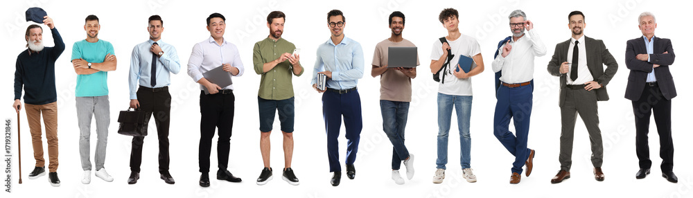 Group of different men on white background