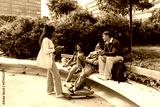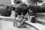 A female student stands and holds a phone while listening to a group of three students sitting across from her and smiling