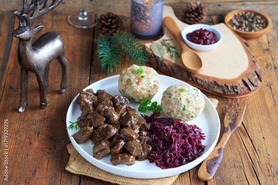 Hirschgulasch mit Semmelknödeln und Rotkraut