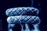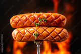 Grilled sausages on fork with herbs over fire flames, close up, copy space