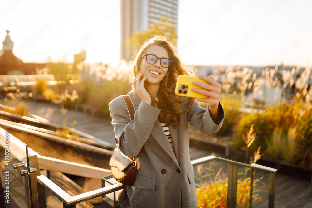 Portrait of a stylish woman wearing glasses and holding a phone, standing on a sunny rooftop. A beautiful woman takes a selfie on her phone, blogging outdoors. Blogging concept, technology. Lifestyle.