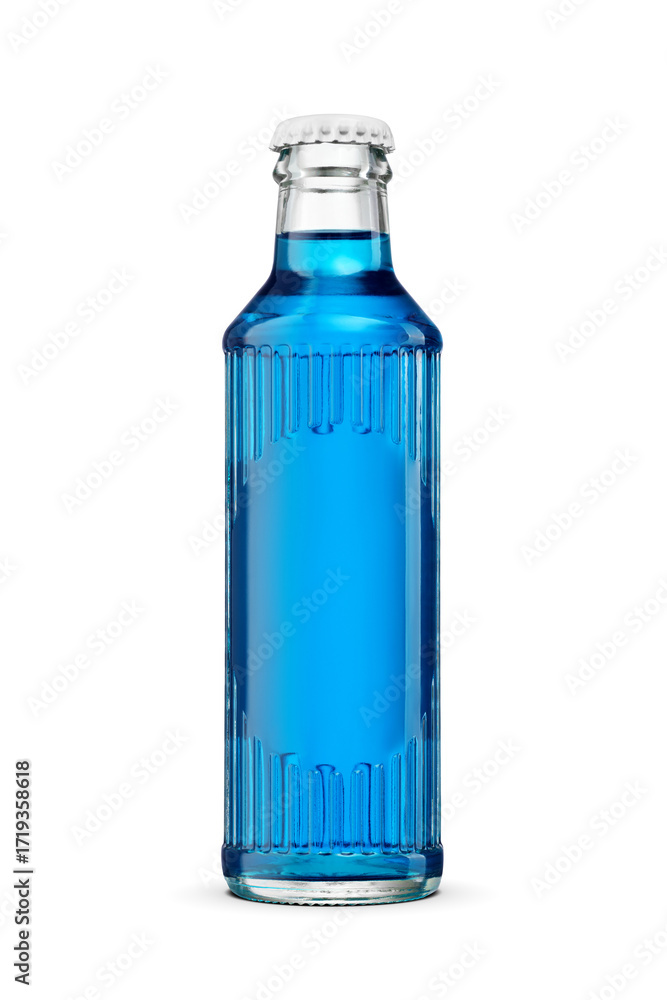 Small clear 200ml glass bottle with blue soda soft drink isolated. Transparent PNG image.