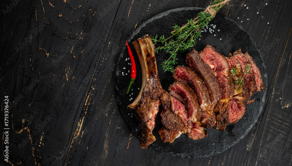 Sliced grilled tomahawk steak with herbs and spices on dark wooden background, top view, copy space