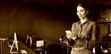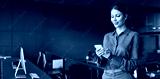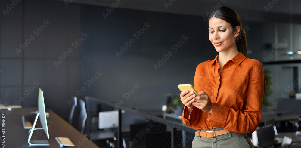Smiling Latin Hispanic female businesswoman holding smartphone in office for trading, investing, banking online. Young Indian business woman manager using cell phone mobile standing at workspace