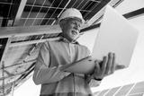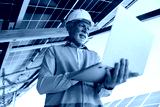 Senior Male Worker in Safety Gear Inspecting Solar Panels with Laptop