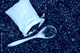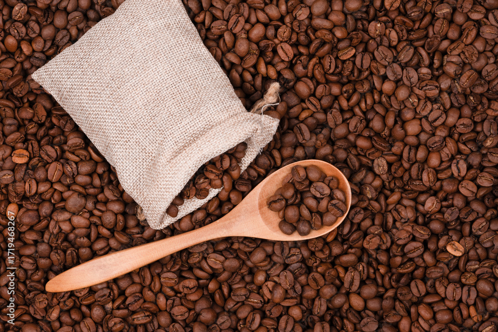 Jute bag with coffee beans and wooden spoon on the background of roasted coffee beans. coffee beans background texture.