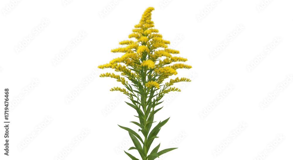 Isolated Solidago with Small Yellow Flowers and Green Leaves on a Stem, Autumn Plant