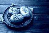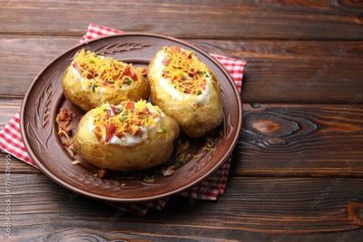 Tasty baked potatoes with sour cream, green onion, cheese and bacon on wooden table, closeup. Space for text