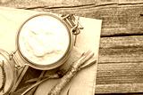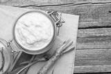 Tasty horseradish sauce and roots on wooden table, flat lay. Space for text
