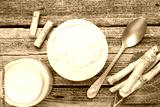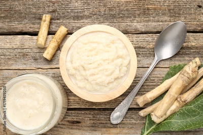 Tasty horseradish sauce, spoon and roots on wooden table, flat lay