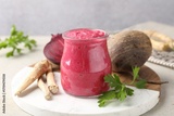 Tasty horseradish sauce with beetroot, parsley, roots and vegetables on light table, closeup