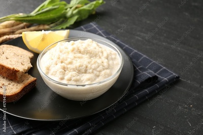 Tasty horseradish sauce served on black table, closeup. Space for text