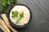 Tasty horseradish sauce with parsley and roots on black table, flat lay. Space for text