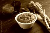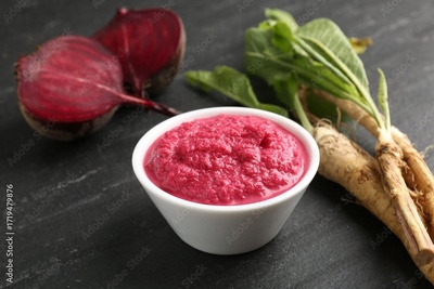 Tasty horseradish sauce with beetroot, roots and vegetable on black table, closeup