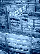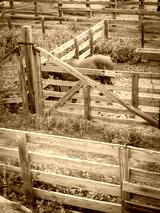 Brown American Quarter Horse reaches through wooden fence to nibble grass and yellow flowers. The rustic paddock and natural behavior reflect quiet moments in historic livestock Forth Worth, TX