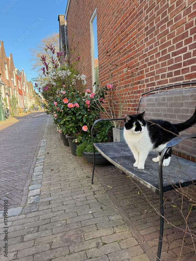 Stray cat on bench near different plants on city street