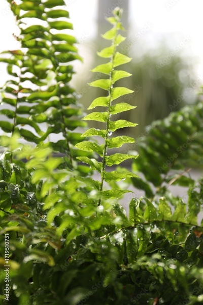 Beautiful Nephrolepis plant with water drops indoors, closeup