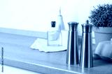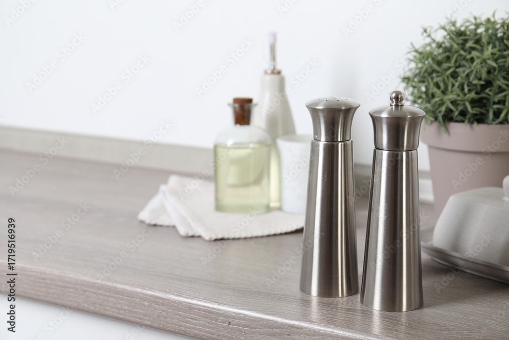 Metal salt and pepper mills on grey wooden counter indoors, closeup. Space for text