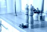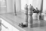Salt, pepper mills and mint on grey wooden counter indoors, closeup. Space for text
