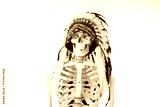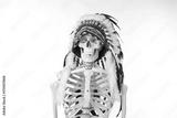 Artificial human skeleton wearing warbonnet (Native American chief headdress) isolated on white