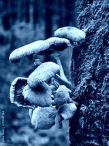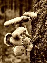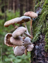 Mushrooms growing on a tree trunk in a lush green forest setting during daylight hours