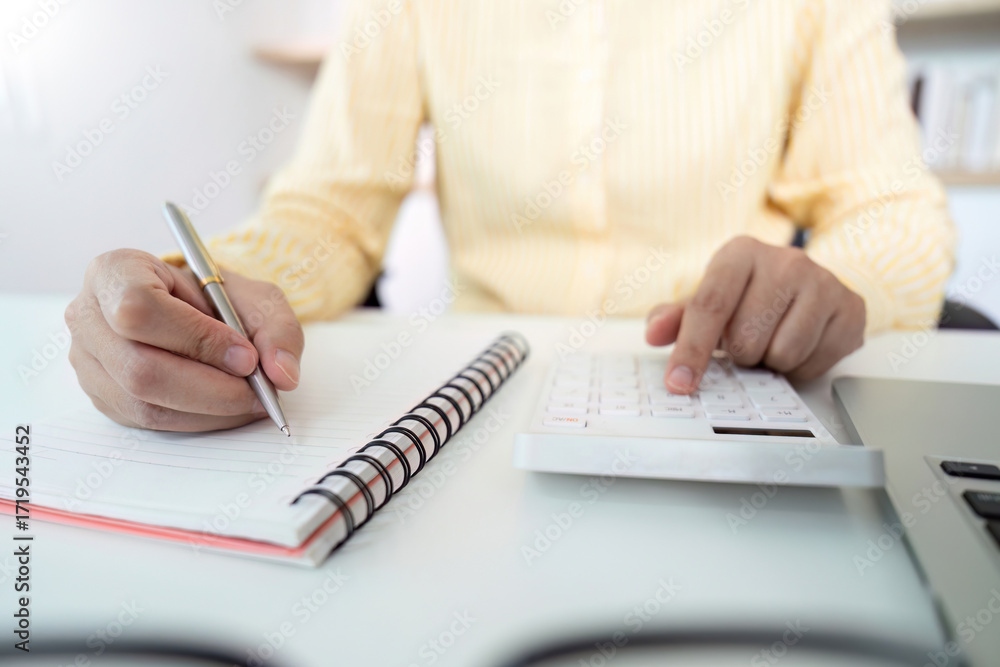 Work from Home. Person calculating expenses while writing notes in a notebook.