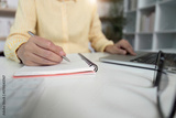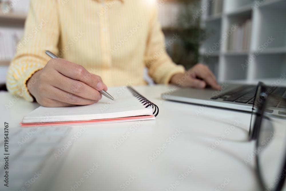 Work from Home. Individual taking notes in a notebook while working on a laptop.