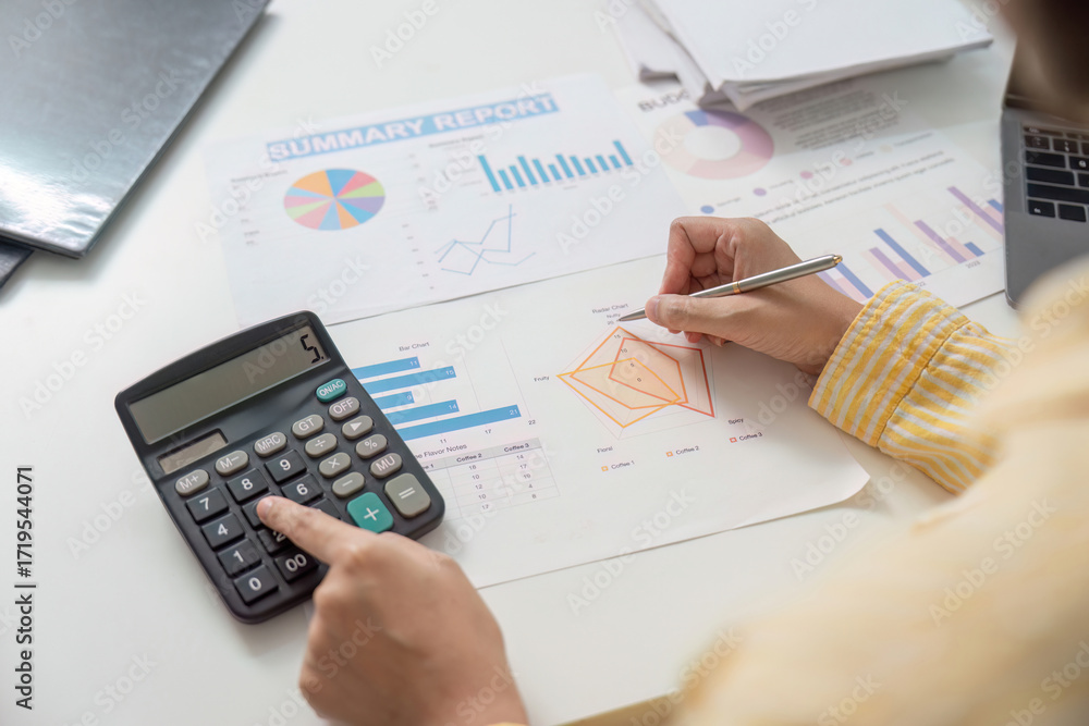 Data Management. Professional using calculator and pen for report analysis.